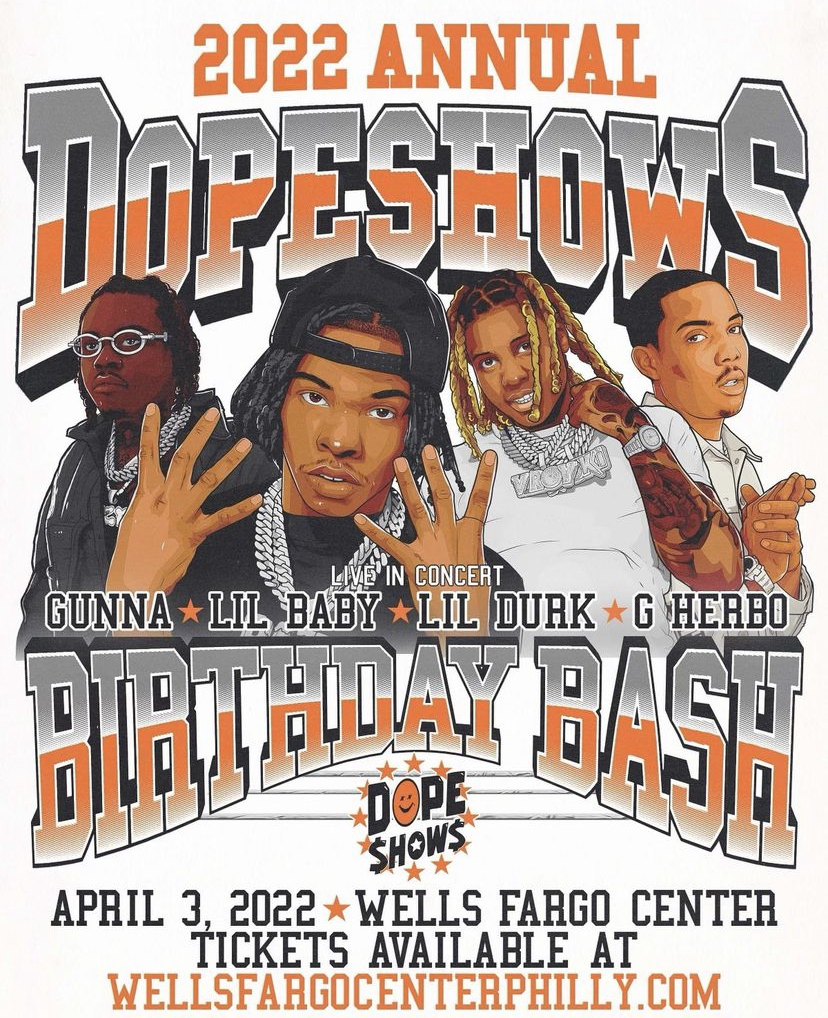 DOPE SHOWS BIRTHDAY BASH WITH Lil Baby Lil Durk Gunna G Her on February 10. Up to 3 cash back Find tickets for Dope Shows Birthday Bash Lil Durk in Philadelphia PA at Wells Fargo Center - PA on Sunday April 3 2022. To celebrate five years of great success in Philadelphia Dope Shows just announced that they will be hosting a Birthday Bash with headliners Lil Baby Lil Durk Gunna and G Herbo.